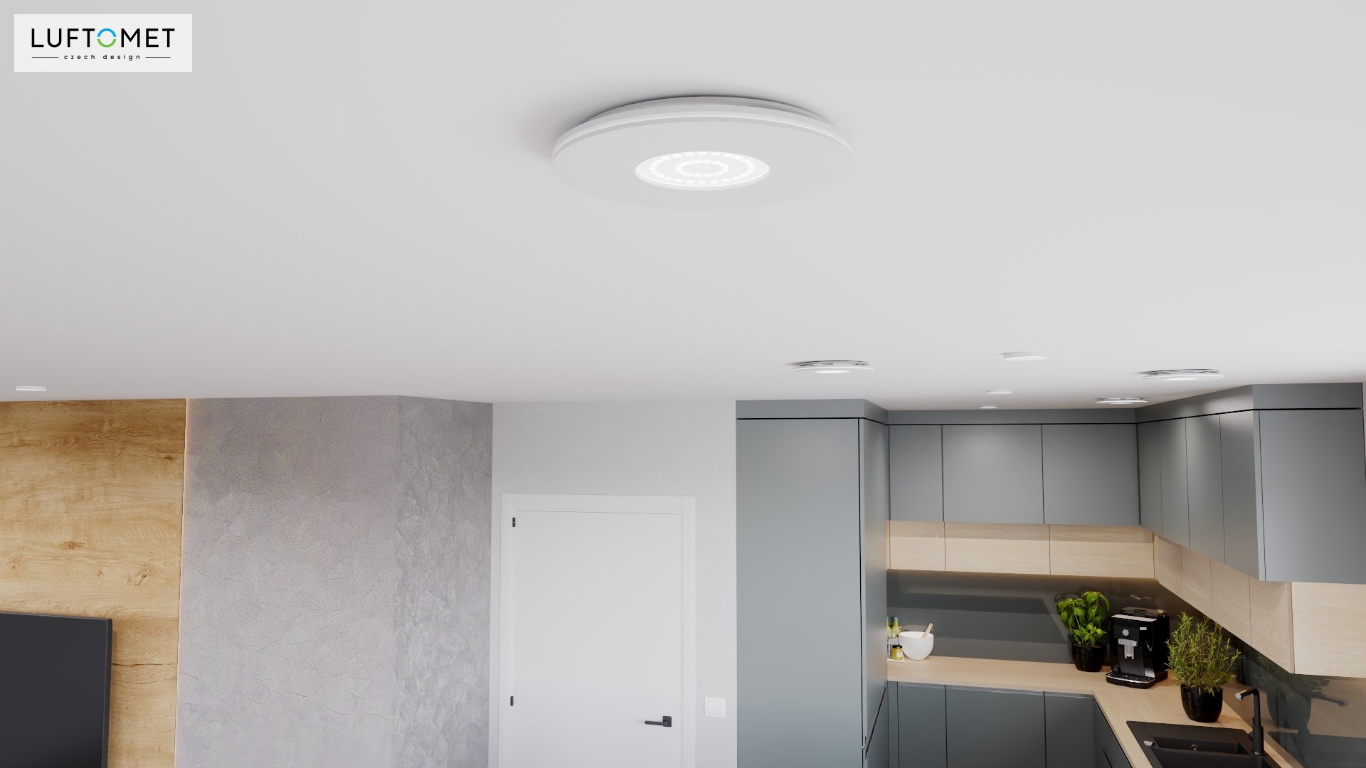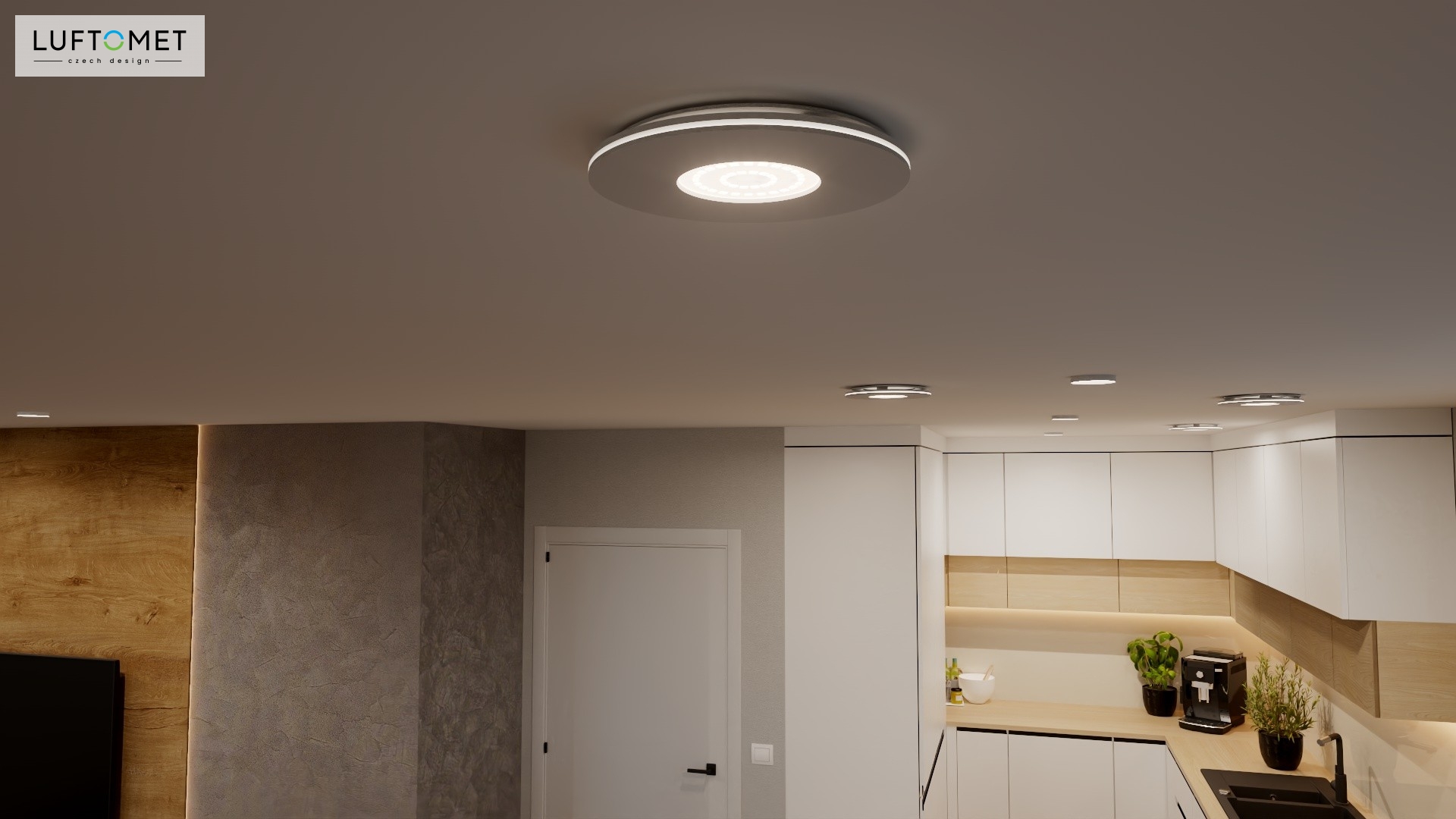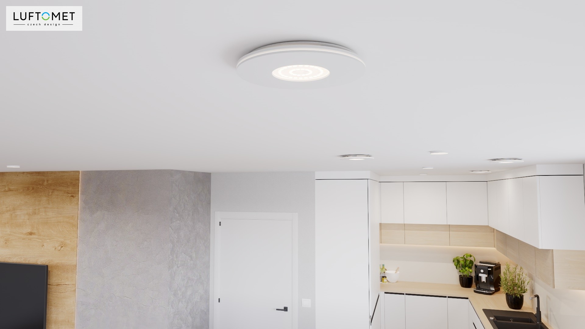 Využítí LUFTOMET Lumen plast kruh v bílé lesklé barvě v interiéru.