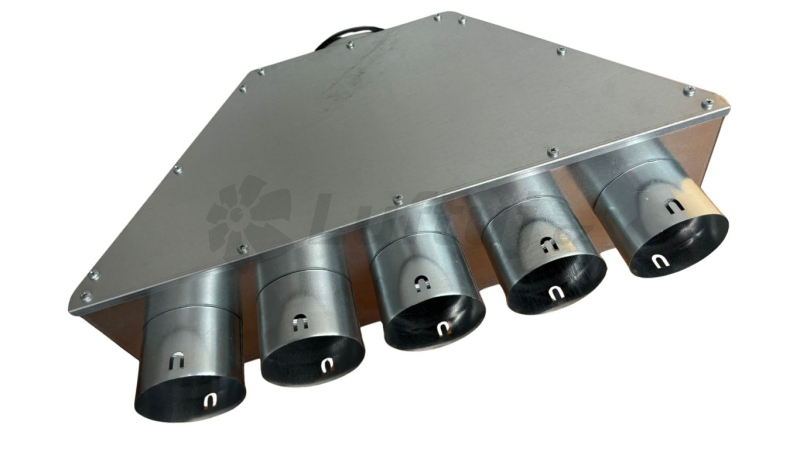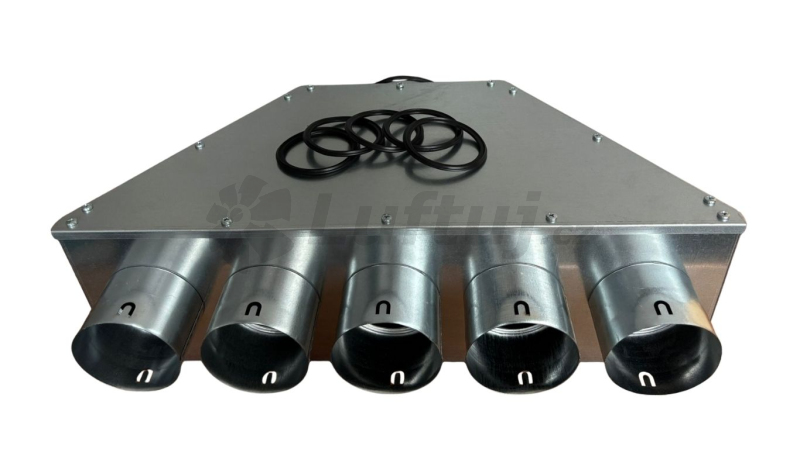 Rozdeľovací box pre systém vetrania s rekuperáciou, ktorý vyniká svojim tvarom, ktorý napomáha rovnomernému prúdeniu vzduchu. Materiál: - box: obojstranne pozinkovaný plech hr. °, špecifická hmotnosť 1,22g/cm3 Vlastnosti: - váha boxu 6,9kg - výustok DN 160 je určený pre napojenie "SPIRO" potrubia (Ø 160mm) - vyústky DN 90 pre flexibilné potrubie KLIMAFLEX SB (vnútorný Ø 94,6 +- 0,5mm) alebo ponúkame DALFLEX, ktorý plne nahrádza Klimaflex SB. - rozmerové tolerancie podľa ČSN ISO 2768-1 Súčasťou dodávky: - 1ks tesniaceho krúžku DN 160 - 4ks tesniacich krúžkov DN 90 - montážne úchyty - poistky proti vysunutiu flexibilného potrubia sú súčasťou výustkov Použité materiály neobsahujú nebezpečné látky v súlade s nariadením (ES) 1907/2006 (REACH) a sú v súlade so smernicou 2011/65/EÚ (ROHS) o obsahu olova, kadmia, ortuti a šesťmocného chrómu, polybrómovaných bifenyloch (PBB) a polybrómovaných difenyléteroch (PBDE).