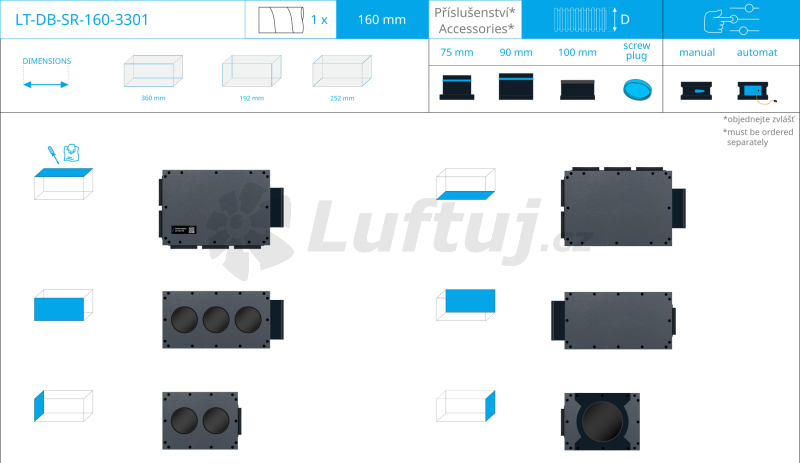 Modul klapky s manuálnym ovládaním je súčasťou radu LUFTooL Distribute. Klapka umožňuje ručné riadenie-otváranie a zatváranie vzduchovodov v siedmich polohách. Spolu s ďalšími prvkami modulárneho systému slúži na zónovanie vetrania s rekuperáciou tepla v rodinných domoch, bytoch a malých prevádzkach. Systém je možné použiť pre prívod aj odvod vzduchu s prietokmi do 100 m3/hv jednej vetve. Systém LUFTooL Distribute je: • inovatívny systém na rozdelenie prúdu vzduchu do jednotlivých zón/miestností • modulárny (jeho komponenty je možné kombinovať) • dimenzovaný pre flexibilné plastové potrubie s priemerom 75 a 90 mm a tradičné potrubie SPIRO 100 mm • určený na vetranie v rodinných domoch a malých prevádzkach s prietokmi vzduchu jednotlivými vetvami do 100 m3/h • veľmi tesný systém dosahuje tesnosť triedy D podľa STN EN 15727 • vhodný pre prívod aj odvod bežne znečisteného vzduchu (bez chemických látok a pod.) vykonať bez demontáže modulu klapky • vyrobené z materiálu ABS a PETG Nastavenie prietoku: Zmena polohy klapky sa dosiahne miernym nadvihnutím madla klapky nad podložku, pootočením a spustením madla späť do jednej zo siedmich pripravených pozícií. Balenie obsahuje: Plastový výlisok tela klapky (ABS) osadený listom klapky, osou klapky (PETG) a madlom na zmenu polohy. Návod. Balené do plastového vrecka. Modul klapky je možné z jednej strany priskrutkovať napr. na: LUFTooL konektory (LF-CO-125) - ktoré sú vložené do distribučného boxu LUFTOMET® Flat boxy Na druhej strane je modul pripravený na pripojenie na LUFTooL hrdla pre potrubie: LT-SP-75-SR-IT....hrdlo pre flexibilné potrubie 75 mm LT-SP-90-SR-IT....hrdlo pre flexibilné potrubie 90 mm LT-SP-100-SR-IT....hrdlo pre tradičné potrubie SPIRO, biely plast alebo flexibilné potrubie SONO, Mastersan a pod dimenzie 100 mm. Príklady inštalácie 1) osadenie cez konektor k distribučnému boxu - reguluje prietok vzduchu vychádzajúci z distribučného boxu do jednotlivých potrubí 2) osadenie pred LUFTOMET Flat box - reguluje prietok vzduchu pred vyústkou Základné požiadavky na prevádzku systému: - max. prietok vzduchu jednou plne otvorenou klapkou je 100 m3/h. Podľa polohy klapky a percenta jej uzavretia sa maximálny povolený prietok (LFmax) úmerne znižuje. Prietok vzduchu jedným alebo viacerými rozdeľovacími boxmi (PBmax) generovaný rekuperačnou jednotkou v jednom smere (prívod/odvod) nesmie presiahnuť súčet maximálnych prietokov všetkých klapiek PBmax < ΣLFmax - teplota vzduchu prúdiaceho klapkou 10-40°C - teplota vzduchu v okolí servopohonu a 10-40°C, vlhkosť 30-90 % RH Servis Na čistenie systému potrubia je možné list klapky ľahko demontovať cez vhodne umiestnený servisný otvor distribučného boxu. Na demontáž osi klapky je nutné odmontovať dve skrutky pomocou krížového skrutkovača. Telo klapky ani hrdlo nemusia byť demontované.
